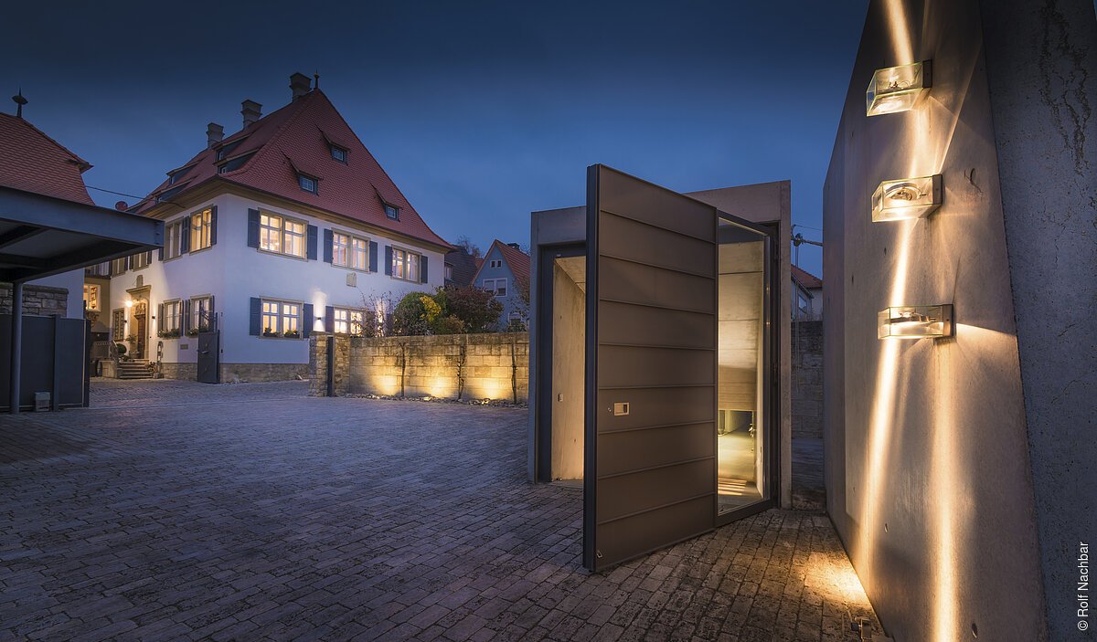 Seit bald zwanzig Jahren liegen die Geschicke des Weingutes Brennfleck nun schon in den Händen von Susanne und Hugo Brennfleck. Gute 420 Jahre befasst sich die Familie bereits mit dem Weinan- und -ausbau. Der Tradition und dem Ort verbunden, zeigten sich die Brennflecks zuletzt auch immer wieder offen für Neues und Modernes. In Sichtweite des Stammhauses, ein barock überformter, im Kern jedoch mittelalterlicher Gutshof, wurde an der Papiusgasse und hoch über den Wehrmauern des Weindorfes Sulzfeld im Jahre 2007 ein neues Kelterhaus errichtet. Tür- und Torlaibungen stoßen betonsichtig aus der mit Muschelkalk verkleideten Gebäudehülle hervor.