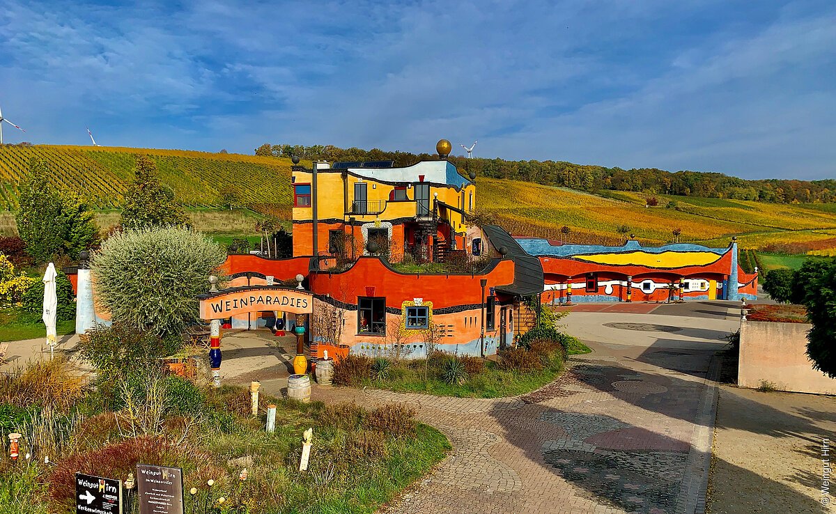 Die Winzerfamilie Hirn in Untereisenheim war Ende der 1990er Jahre allerdings doch so fasziniert von Hundertwassers fantastischem Realismus, dass sie bei ihm den Entwurf eines Weingutes mit Gästewohnungen in Auftrag gab. Nach dem Tod Hundertwassers, er starb 72-jährig im Februar 2000, setzte Heinz M. Springmann, einer von mehreren Projekt-Architekten, die Hundertwasser autorisiert hatte, seine Häuser zu bauen, die Planung Hundertwassers ins Werk. So kam es also, dass am Ortsausgang von Untereisenheim ein Bauwerk wie aus 1001 Nacht oder aus dem Roussillon entstanden ist. Die Grundfarbe des Hauses erinnert jedenfalls an die Ockersteinbrüche in dieser südfranzösischen Region, aus der bis Mitte des 20. Jahrhunderts alle Maler ihre Pastellkreiden bezogen haben. Allerdings wirkt das Weingut Hirn auch deshalb so anziehend auf Besucher, weil der Winzer Matthias Hirn dort in einer Vinothek seine fulminanten Weine verkauft und man als Weingenießer oder Reisender im Weingut sogar übernachten kann. Frühes Vorbuchen empfiehlt sich da aber allemal. In der Vinothek des Weingutes oder auf der großen Terrasse findet man freilich immer noch ein Plätzchen, um zu rasten, zu verkosten oder mit Sinn und Verstand zu genießen. Kräftige Rotweine und feinfruchtige Weißweine aus ökologischem Anbau sind die Hirn-Highlights.